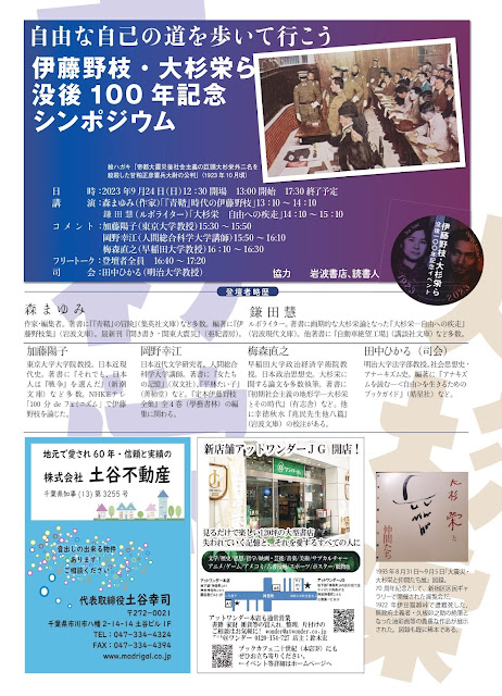 9月24日(日)伊藤野枝・大杉栄らの没後100年記念シンポジウム「自由な自己の道を歩いて行こう」の詳細(会場変更)